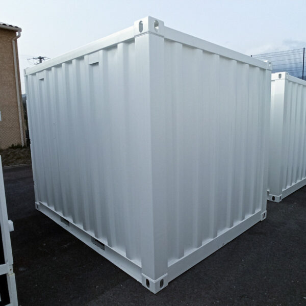 Notre conteneur de stockage 10 pieds dispose d’une ossature réalisée en profils d’acier, épaisseur 3mm, entièrement soudés. Les parois et le plafond sont en tôle laminée d’épaisseur 1,5mm et le plancher est en bois massif, épaisseur 25mm, traité anti-humidité. Il est équipé d’un volet de protection pour le cadenas.